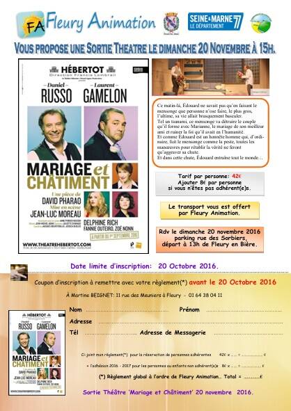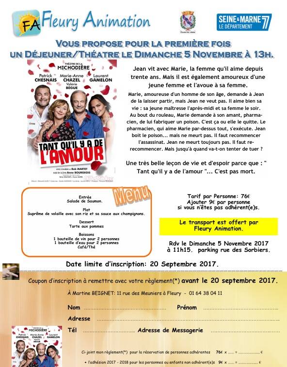 Dimanche 5 Novembre, l'Association "Fleury-Animation" avait concocté une sortie au théâtre de la Michodière pour assister à la pièce"Tant qu'il y a de l'amour".