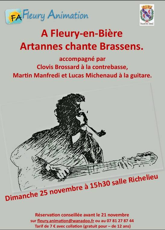 Dimanche 27 Novembre, quatre-vingt-dix personnes s'étaient données rendez-vous à la salle Richelieu. Nous avons eu la chance d'écouter Artannes et trois musiciens, Clovis, Lucas et Martin qui ont revisité le répertoire du chanteur Georges Brassens.